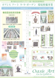 平成23年度~28年度を事業期間に、全蓋アーケードのリニューアルやカラー舗装化も進行中。LED照明化や道路の一方通行化.路上駐輸場整備など、安全安心な買い物通りへ向けたハード整備事業。加えて路上への彫刻アートも設置。地元中学生にそのデザイン企画を中心的に担ってもらおうと、美術展「二科展」にも派遣しています。